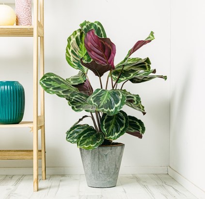 Sus hojas estampadas en plateado, burdeos y verde esmeralda hacen de la Calathea Medallion una delicia para interioristas.